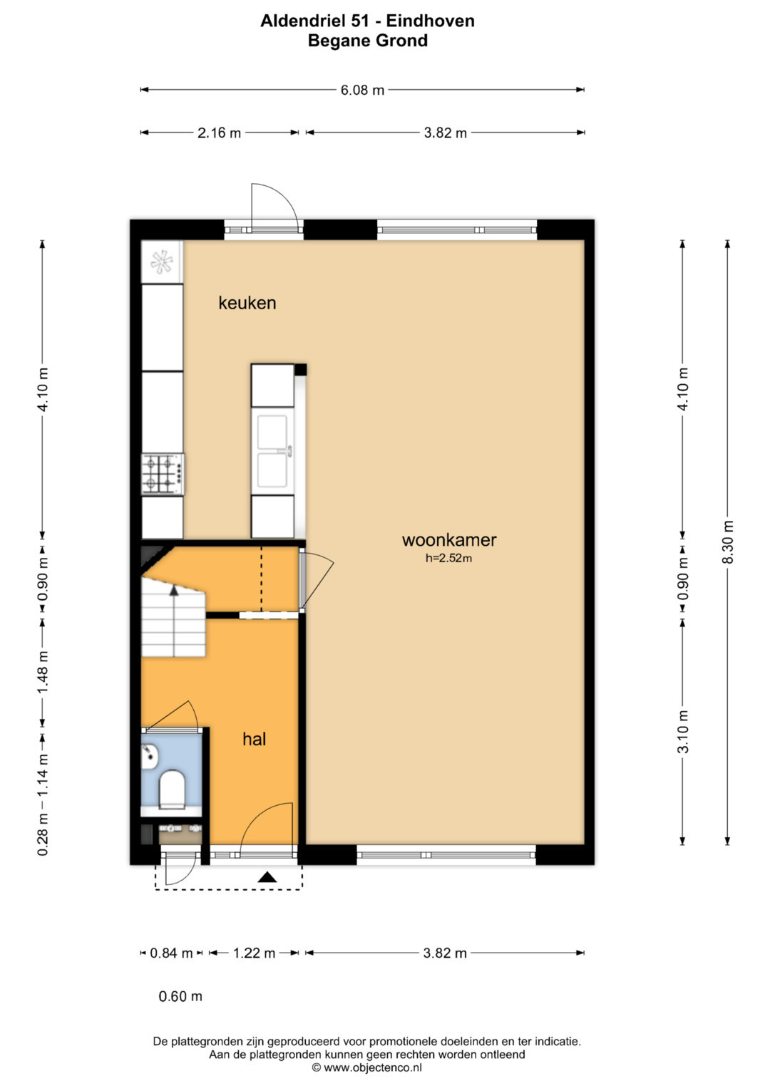Je komt binnen in de hal met toilet en trapopgang. De L-vormige woonkamer is ruim en licht dankzij de grote raampartijen en vormt het hart van de woning. Hier zie je direct de potentie: een mooie leefruimte die met relatief eenvoudige aanpassingen kan worden omgetoverd tot een eigentijdse en sfeervolle woonkamer.
